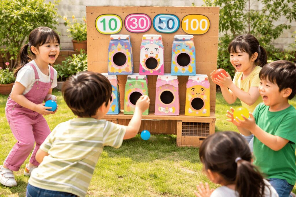 牛乳パックは小さな的や得点箱にして、投げる距離を変えると年齢差があっても公平に遊べます。
