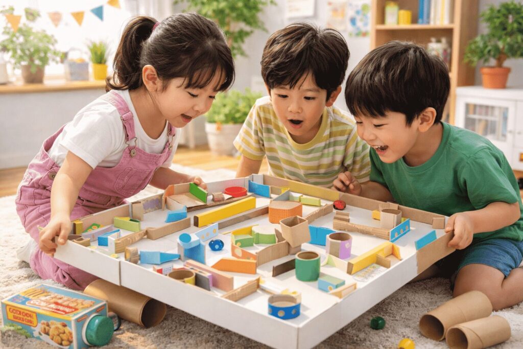段ボールは的当てや迷路の土台になり、遊びながら試行錯誤もしやすい素材でしょう。