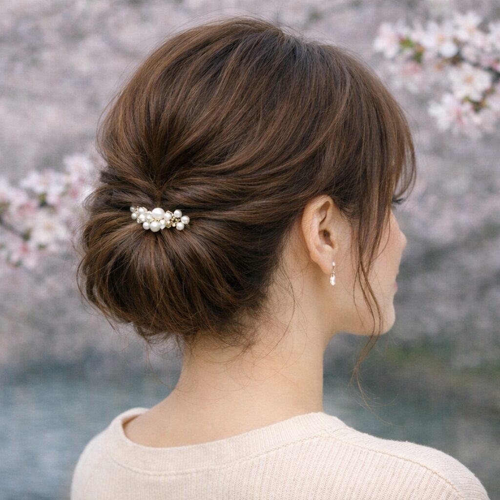 お花見のヘアスタイルで上品な大人っぽさを演出したいなら、シンプルシニョンが最適です。