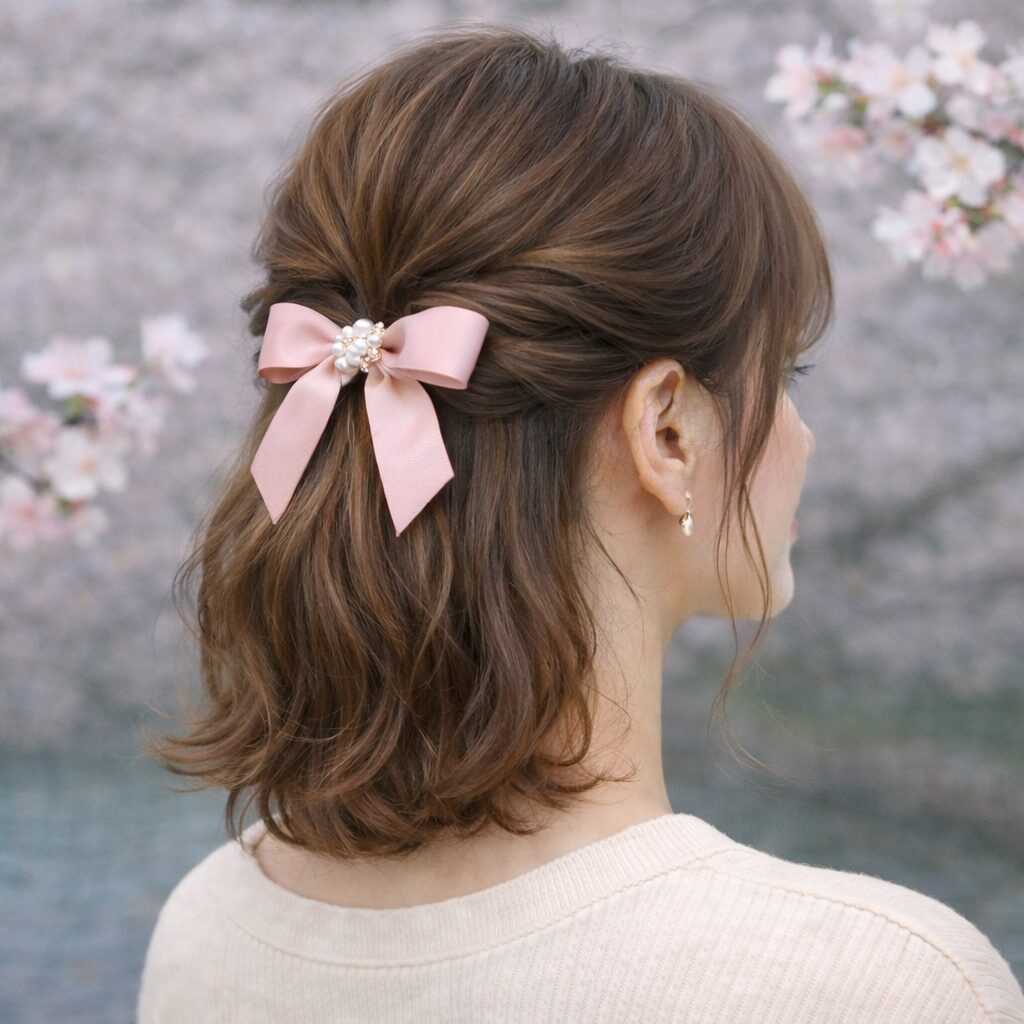 ヘアアクセサリーに桜モチーフのものを取り入れれば、さらに季節感あふれる素敵なスタイルが完成します。